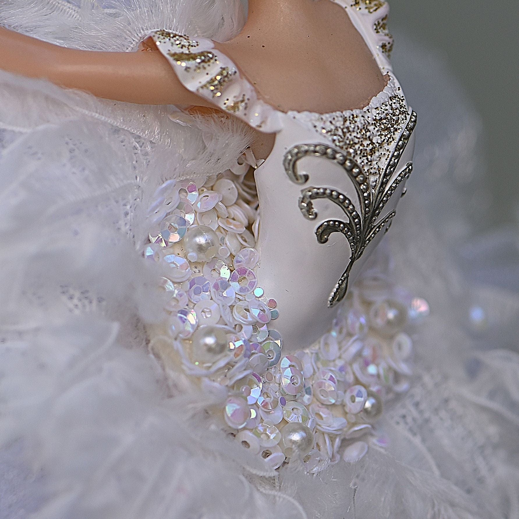 Diese elegante Ballerina tanzt in einem edlen, weißen Ballettkleid aus Tüll und Federn. Das Oberteil ist mit einem champagnerfarbenen Ornament verziert, die Taille mit weißen Pailletten und Perlen geschmückt. Auf dem Kopf trägt sie ein champagnerfarbenes Krönchen. In einer grazilen Pose hält sie ihr linkes Bein nach hinten oben, was ihre Anmut und Beweglichkeit betont.