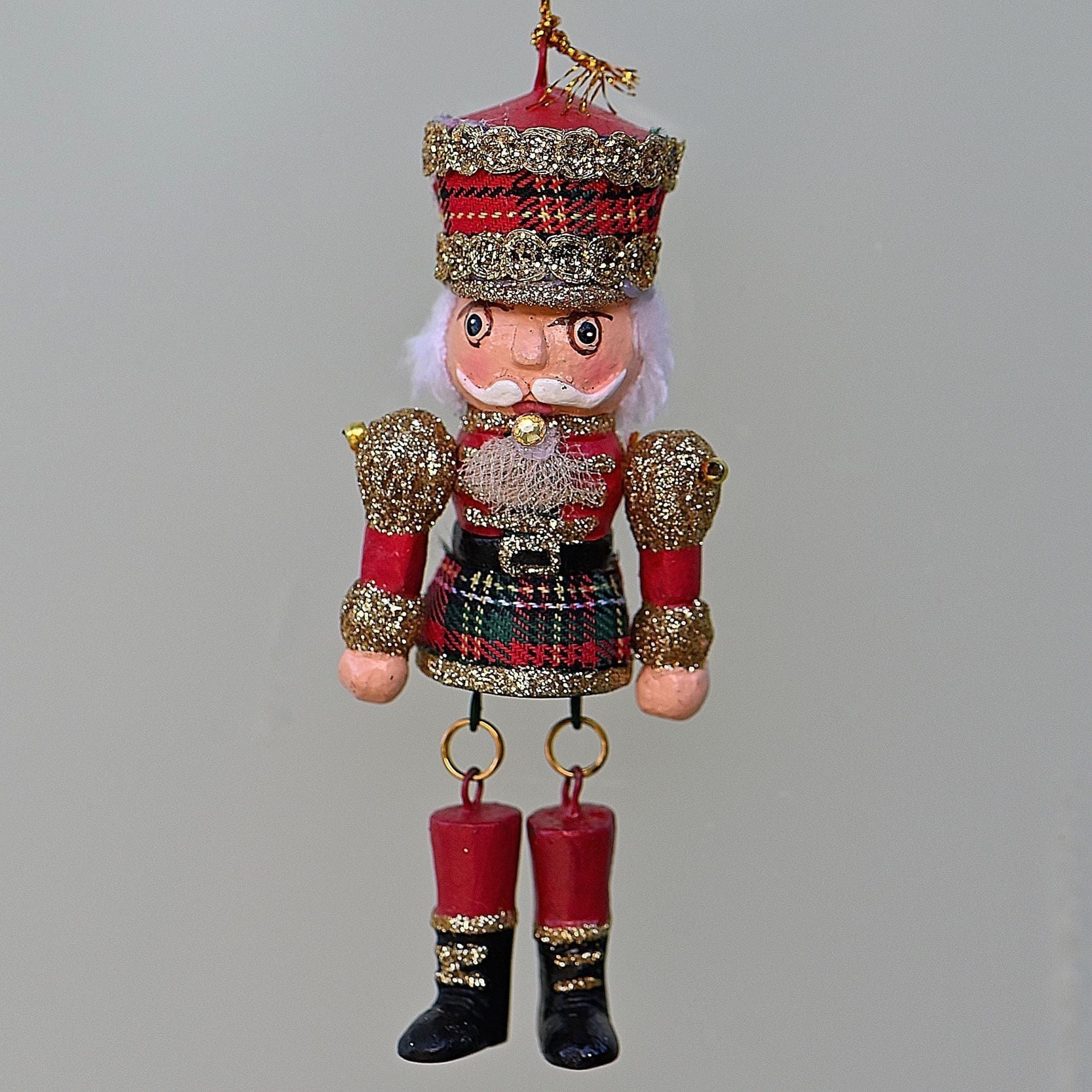 Dieser kunstvoll gestaltete rote Nussknacker vereint nostalgischen Charme mit festlicher Eleganz. Mit einem hübschen Karostoff und goldenen Borten hat er sich fein herausgeputzt. Besonders bezaubernd: die beweglichen Arme und Beine, die dem Anhänger einen einzigartigen Charakter verleihen.