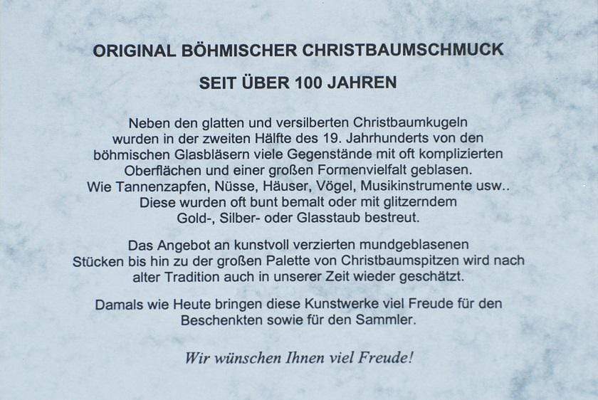 Die Christbaumspitze wird mit der abgebildeten Karte als Garantie für den Original Böhmischen Christbaumschmuck geliefert.