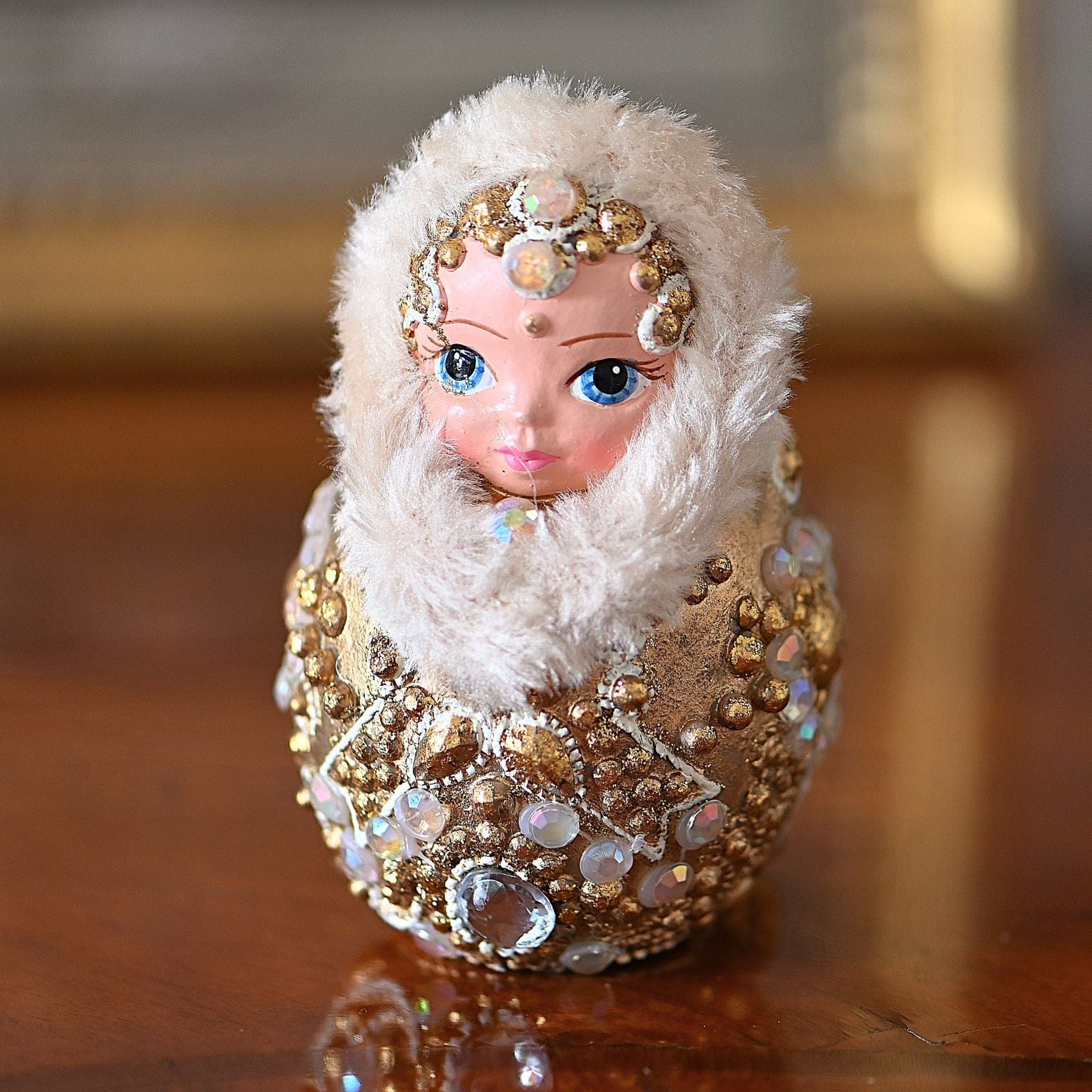 Diese edle Matrjoschka trägt ein prachtvolles, goldenes Gewand das mit Blüten und Schmucksteinen reich verziert ist.
