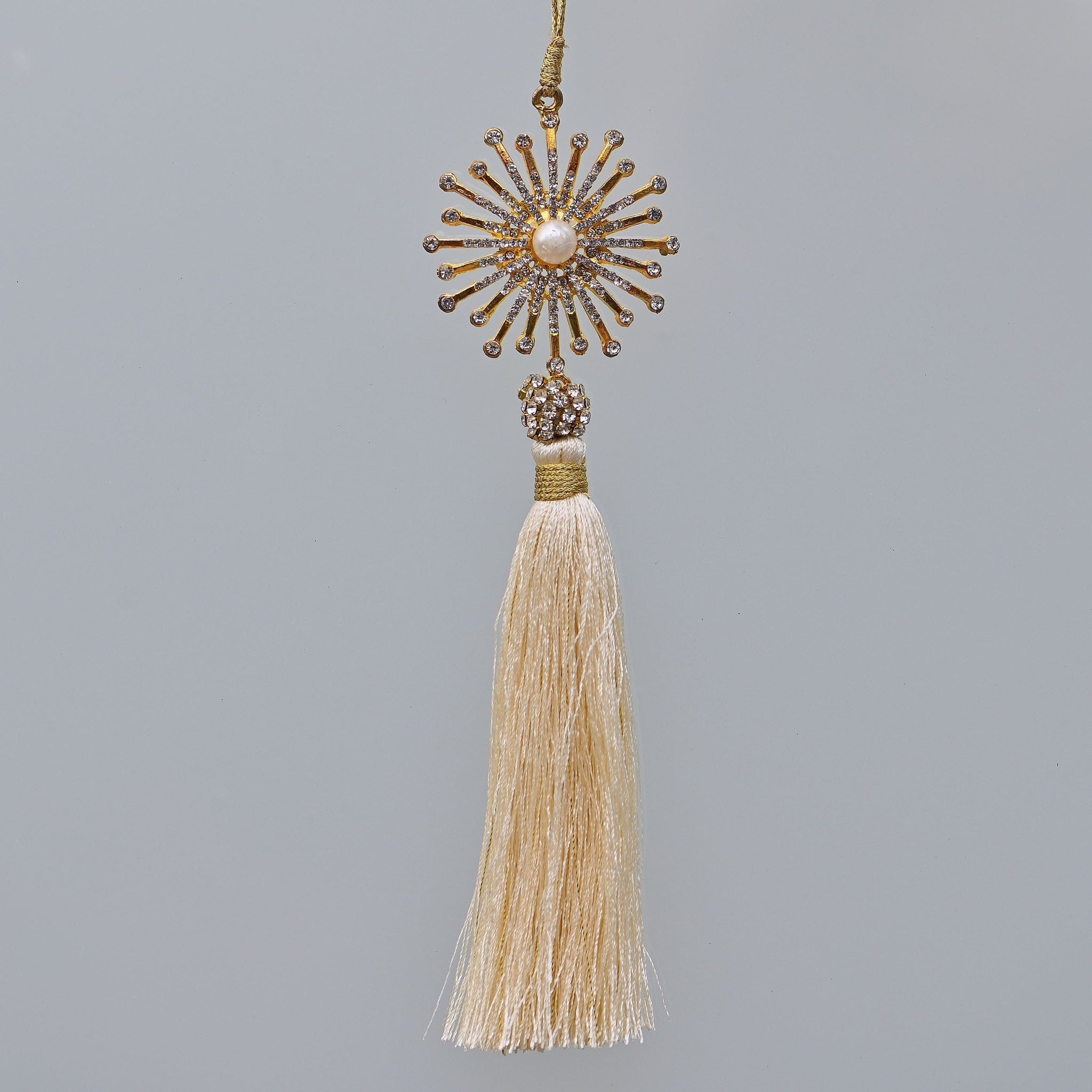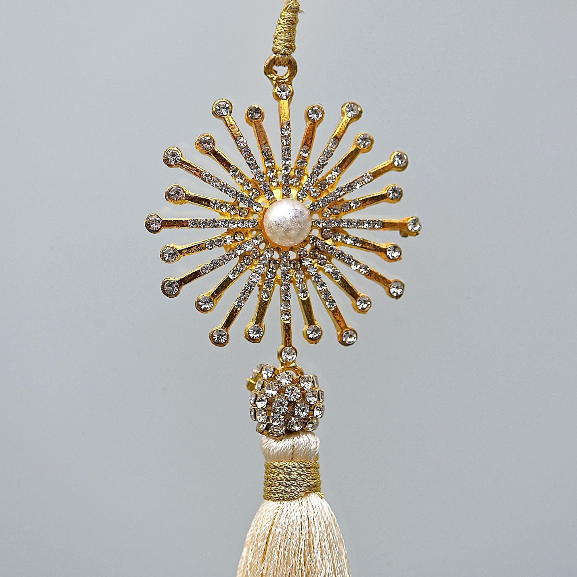 Die handgearbeitete, elfenbeinfarbene Quaste ist mit einem exklusiven Juwelenstern verziert. Der Juwelenstern ist mittig mit einer Perle wie ein antikes Schmuckstück gearbeitet.