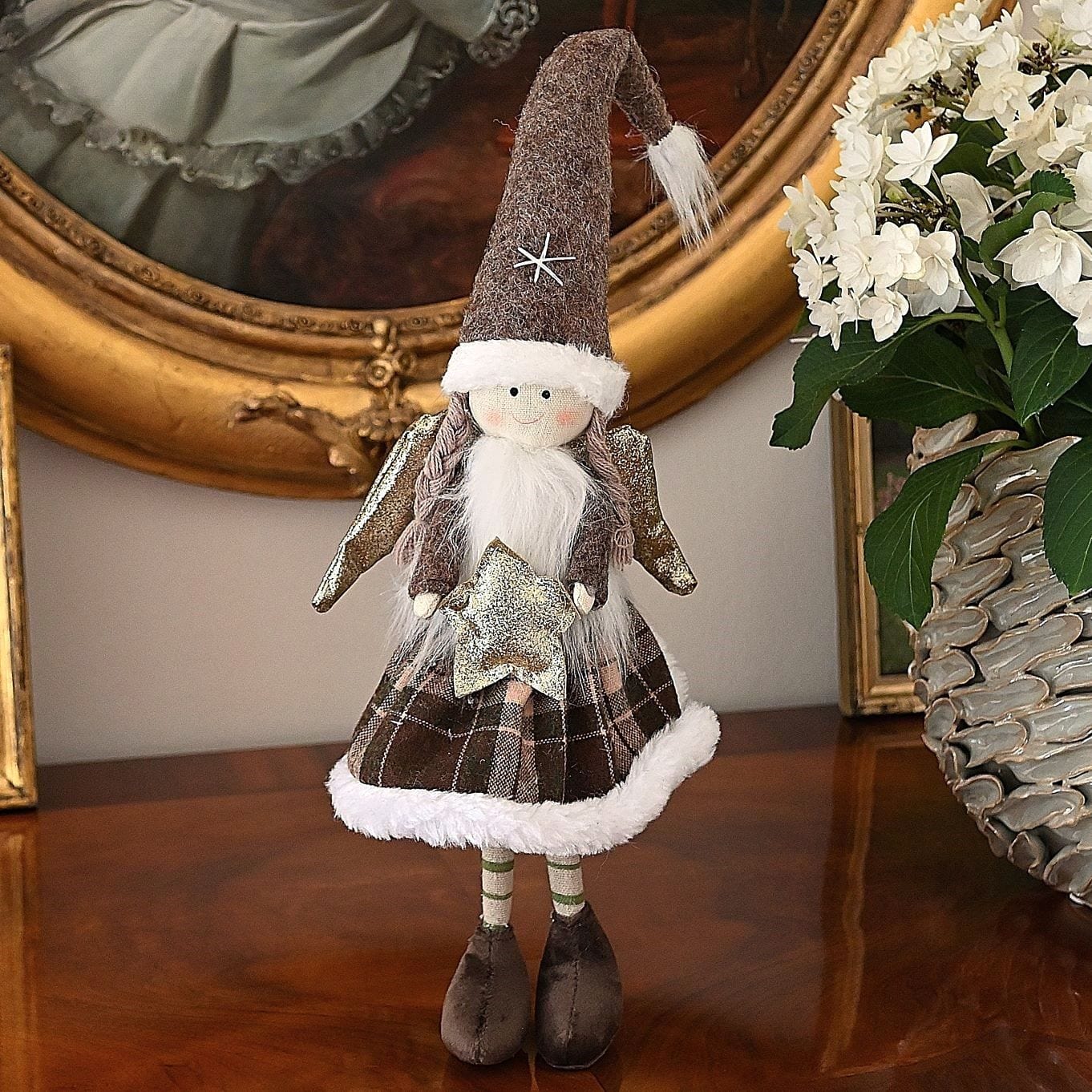 Das entzückende, stehende Weihnachtsengelchen bringt Weihnachtsromantik in Ihr Zuhause. Diese liebevoll gestaltete Stoffpuppe trägt ein braun kariertes Röckchen mit weißem Webpelz, eine braune Filzweste mit weißem Kunstfell, einen braunen großen Hut und schimmernde goldene Engelsflügel. Die dunkelbraunen Füßchen sind beschwert und sorgen so für einen guten Stand. In seinen Händen hält es einen goldenen Stern, der seine Ausstrahlung perfekt abrundet.