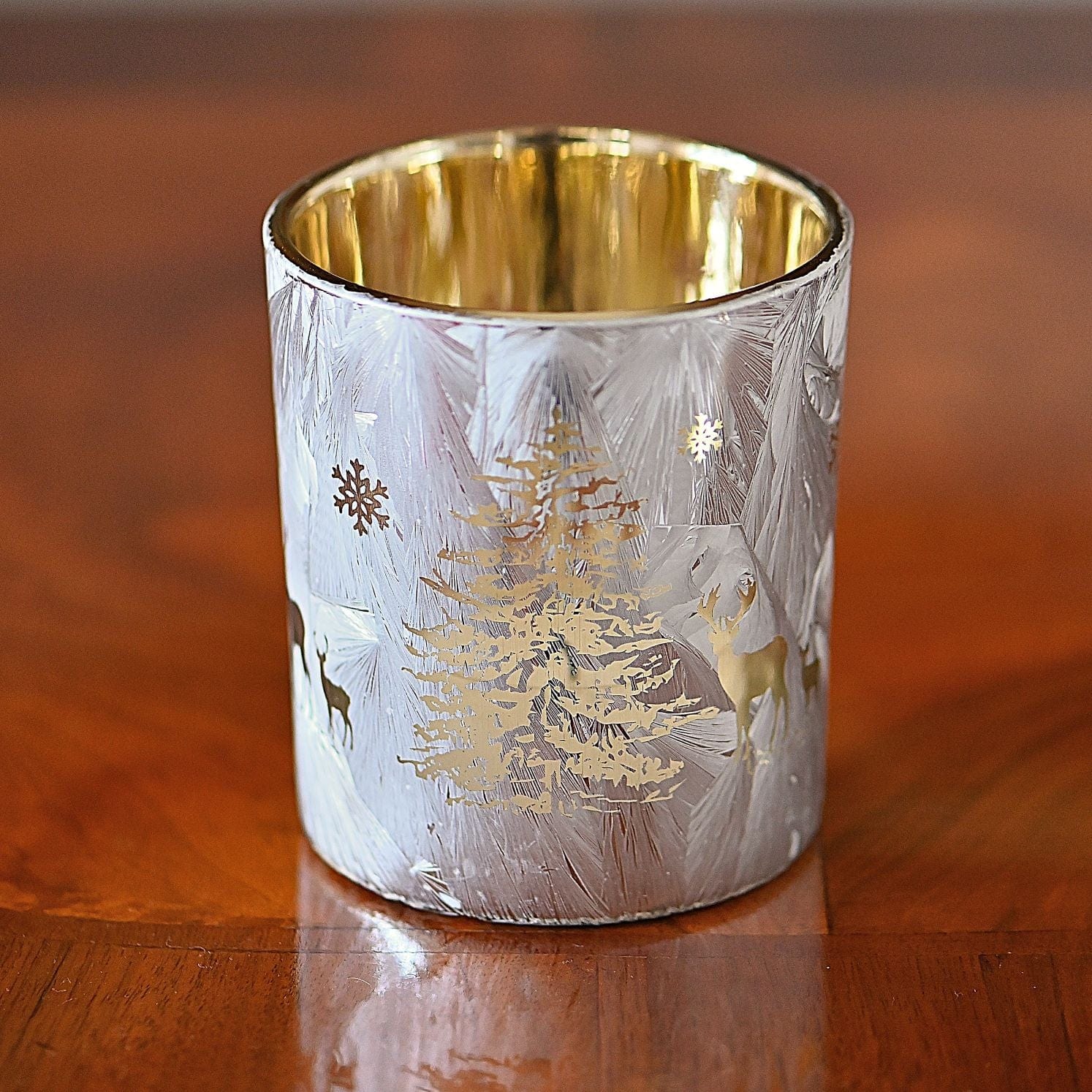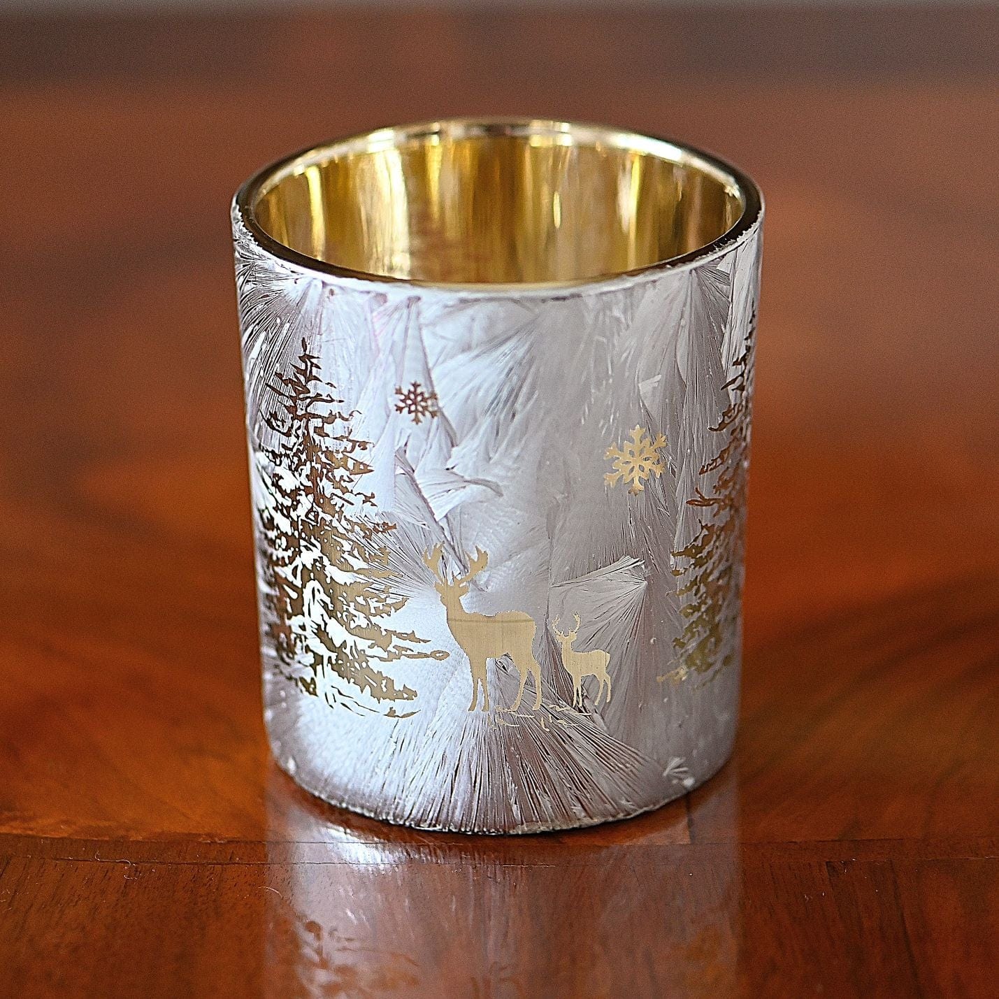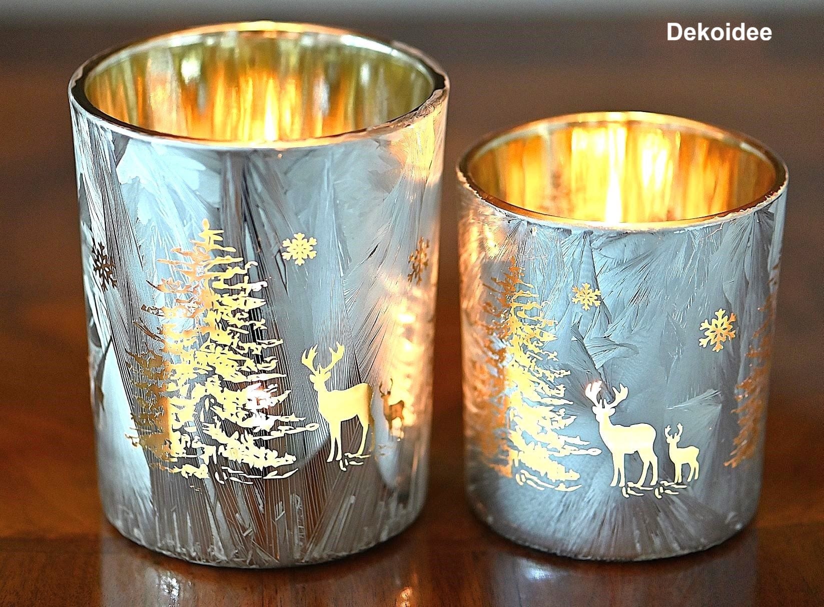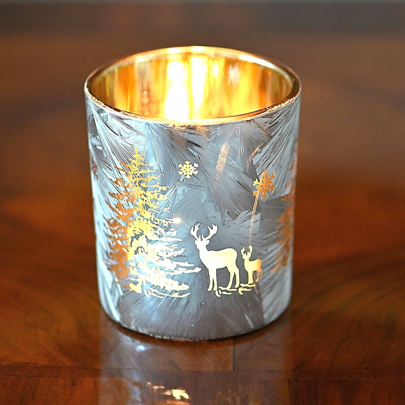 Dieses schöne Windlicht mit Hirschmotiv und Tannenbäumen ist in Eislackoptik gearbeitet. Dadurch wirkt es besonders edel und die goldene Innenfarbe unterstreicht dies nochmals. Ob mit oder ohne Kerze ist dieses Windlicht schön. Seine besondere Pracht entfaltet es aber in den Abendstunden, wenn eine Kerze oder ein großes Teelicht darin funkelt.
