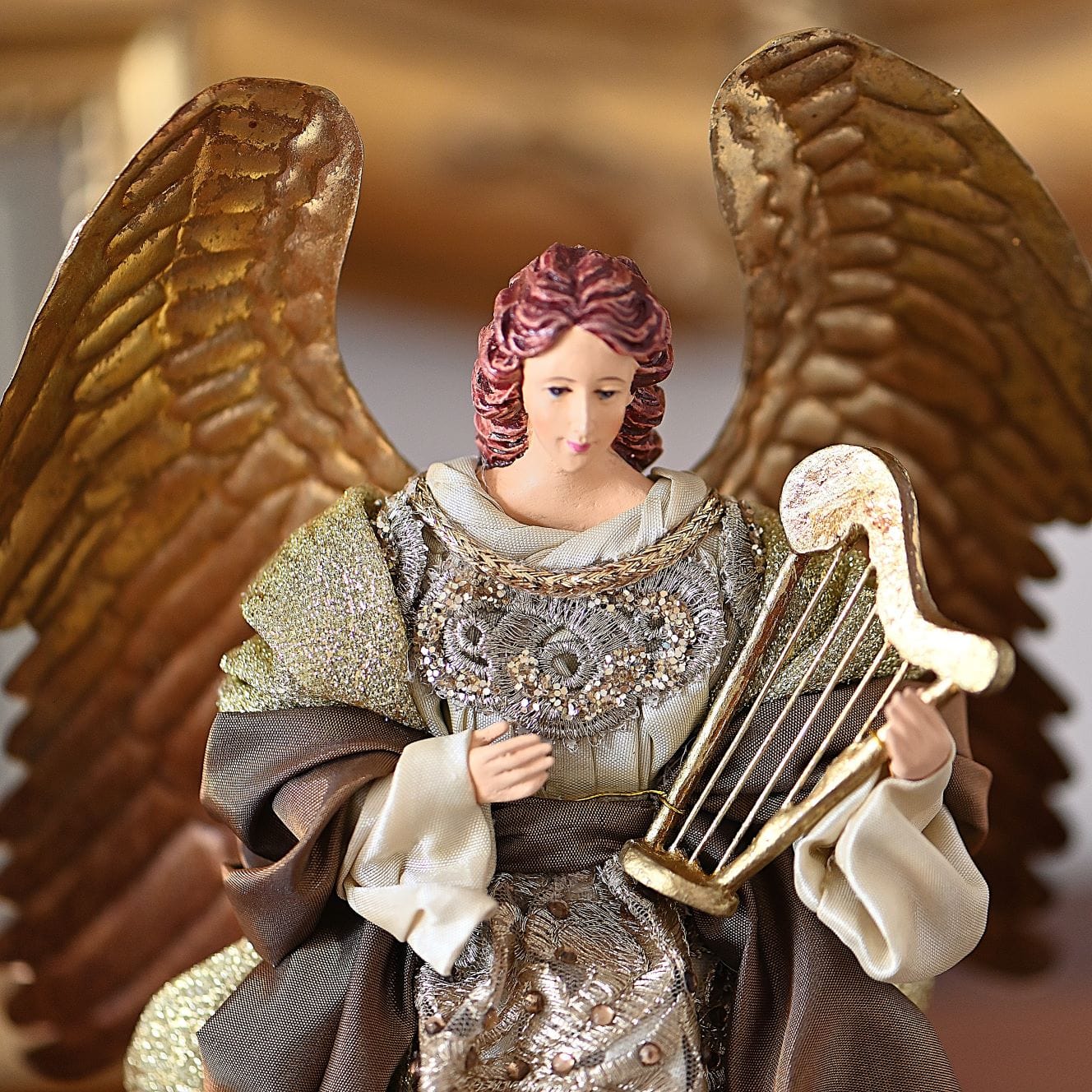 Dieser wundervolle und äußerst aufwendig gearbeitete Engel mit goldenen Metallflügeln strahlt Luxus und Eleganz aus. Gekleidet in feinster Seide und prächtigem Brokat, wird er durch filigrane Borten kunstvoll verziert. In seinen Händen hält er eine Harfe, die seine himmlische Ausstrahlung unterstreicht.